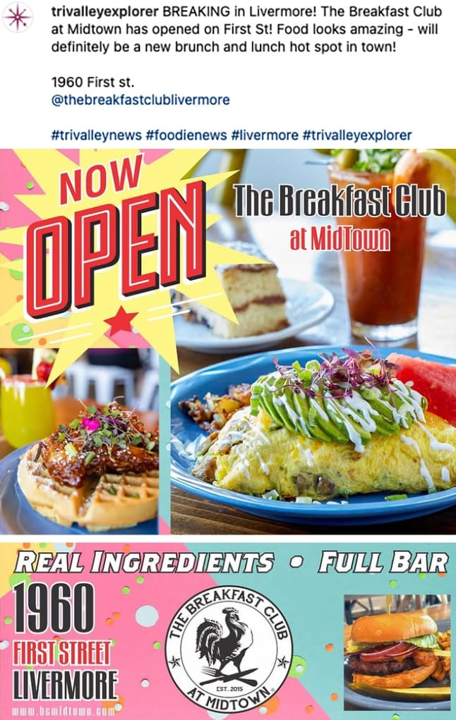 The Breakfast Club at Midtown opened YESTERDAY in downtown Livermore. With numerous Bay Area locations, this breakfast/lunch spot looks amazing: Red Velvet Pancakes, Breakfast Nachos, a full bar, and more! 1960 First St., Livermore.