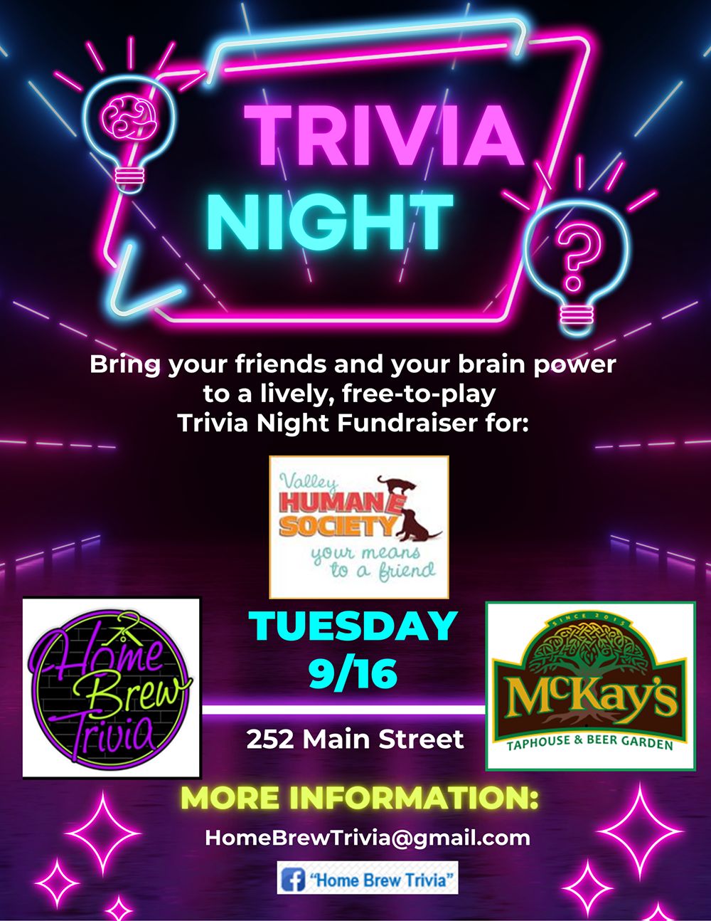 Home Brew Trivia is coming back to McKay’s Taphouse for their monthly trivia nigh, with proceeds benefiting Valley Humane Society! 7pm next Tuesday, 9/16!