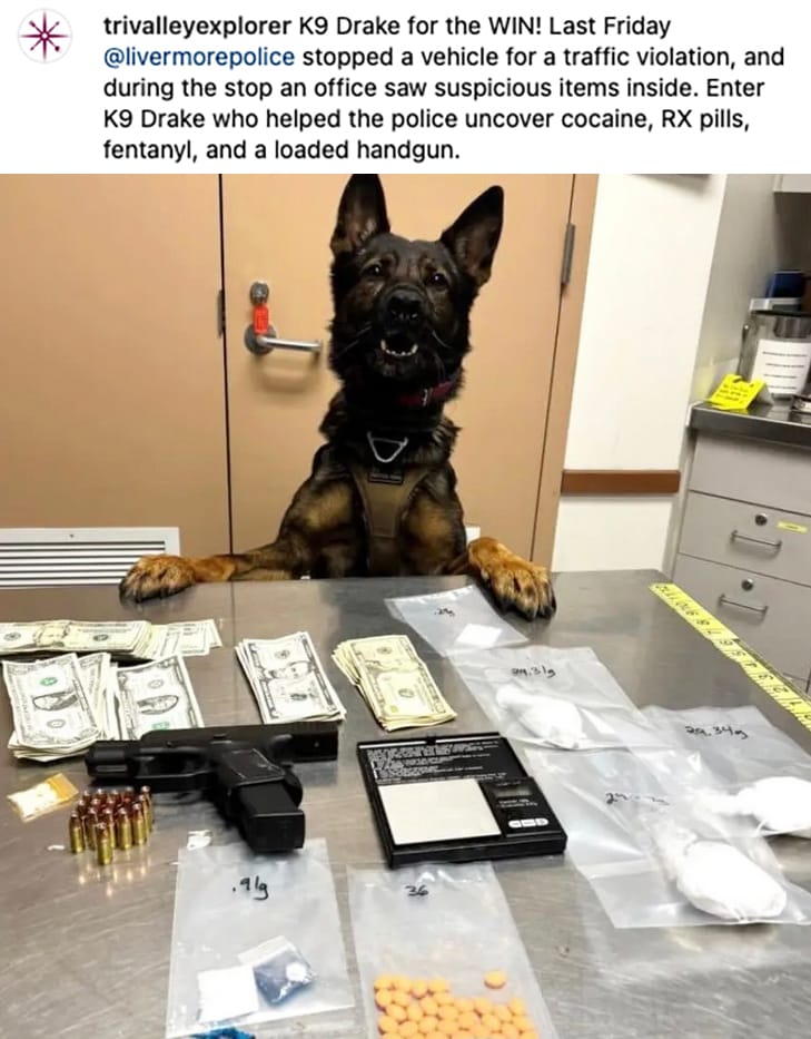 K-9 hero Drake saves the day! During a Livermore traffic stop, Drake sniffed out narcotics, leading officers to cocaine, fentanyl, and a loaded gun. The Oakland driver was arrested on multiple charges. Check out the photo below from our Instagram! 🐶🚔