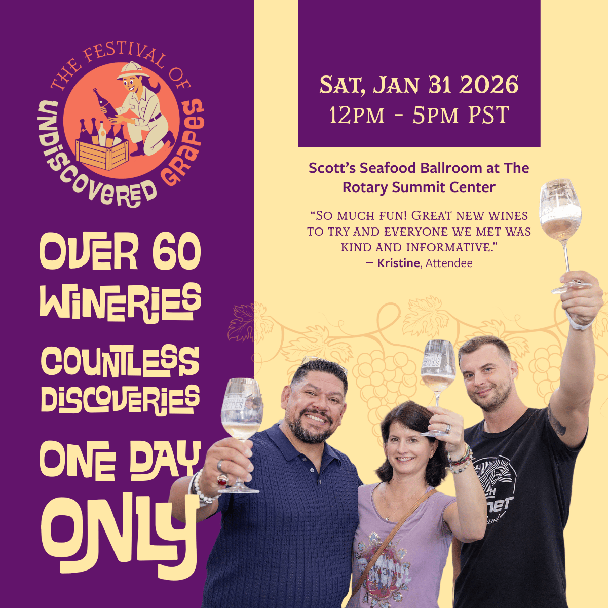 The Festival of Undiscovered Grapes returns to San Jose on Saturday, January 31, from 12–5 PM, bringing together boutique producers from Paso Robles, Sonoma, Livermore Valley, Lodi, Santa Barbara, and beyond. Expect an impressive lineup of wines — many poured by the winemakers themselves, giving you the rare chance to ask questions, hear their stories, and connect directly with the people behind what’s in your glass.