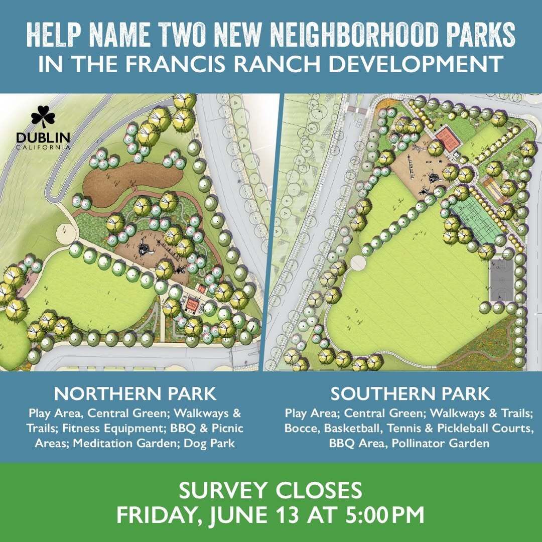 Two brand-new parks are coming to the Francis Ranch Community, and the City of Dublin wants your help naming them! These parks will be more than just green space—they’ll celebrate Dublin’s heritage, identity, and deep connection to the land.