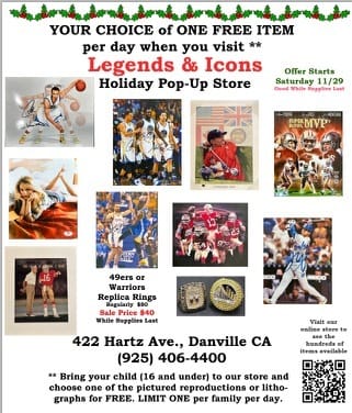 Starting Saturday, 11/29, if you bring your child (ages 16 and under), they can choose a FREE 8x10 reproduction or lithograph — yes, totally free! Choose from fan favorites like the 49ers, Warriors, Steph Curry, Shohei Ohtani, Taylor Swift, Joe Montana, and so many more. Just stop by and pick one out!